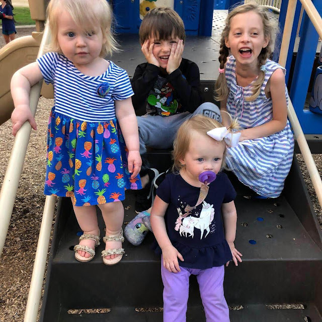 We took a family walk to the neighborhood playground and snapped a family selfie. And of course timed it just right to get Jonah's facial expression when Noelle stepped on Jonah's flip-flop wearing feet.