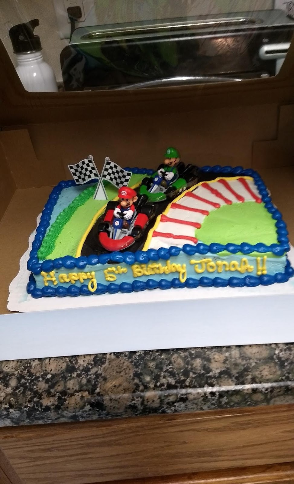 Noelle made all the labels for the food, and all the kids helped me get the food laid out (aka, they sampled the food.) We got a cake made by Walmart with a scene of Mario and Luigi racing. Jonah didn't even finish his cake and ice cream because he was too busy playing with the cars that came off the cake.