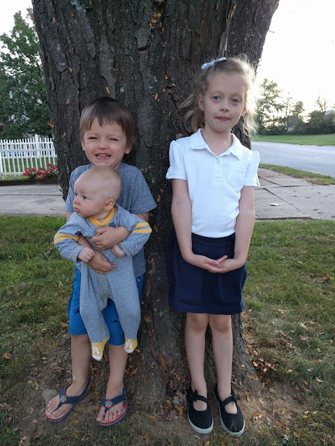 That first morning I was extra grateful that Luke was with us because I was a bundle of nerves and kept tearing up as we drove to school. I kept asking him what if this or that happens, and he kept reassuring me that everything would be fine. We were able to walk her to her classroom and stay for a few minutes as she got settled. When it was time for us to go, she gave us a quick hug and got right back to the task at hand (gluing colored scraps of paper to her name.) Seeing her happy to be there helped settle this mama's heart quite a bit!